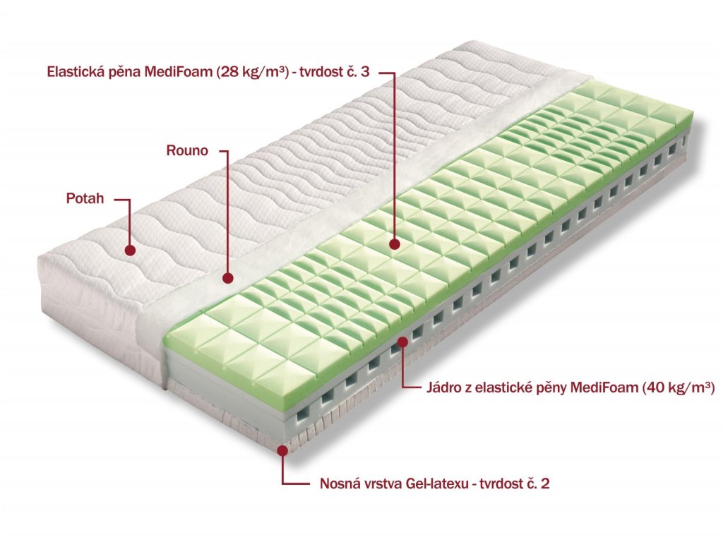 Matrace s jádrem s unikátně provzdušněným řezem. Tento zákazníky časem prověřený profil je složen z tvrzené pěny MediFoam s vysokou gramáží (40 kg/m³). Vrchní vrstva Gel-Latexu ve výšce 4 cm je chladivá, měkká, ale zachovává si svou elasticitu a pružnost, tvrdost č. 2. Tvrdší stranou matrace je speciální červená pěna (32 kg/m³) s antibakteriální úpravou Sanitized, která poskytuje trvalou a účinnou ochranu proti bakteriím, roztočům a plísním, tvrdost č. 3. Má antidekubitní prořez a celkově tuto plochu výborně provzdušňuje. Tuto matraci je díky řezu vhodné uložit i na neprodyšnou pevnou desku. Je vhodná pro všechny typy roštů, včetně polohovacích. Celková výška matrace cca 21 cm.