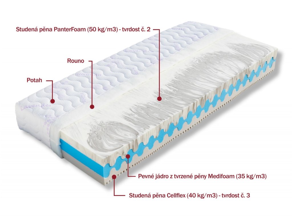 Partnerská matrace z velmi kvalitních holandských studených pěn PanterFoam a Cellflex, které se vyznačují dlouhou životností. Vrchní strana je tvořena značkovou studenou pěnou PanterFoam, která přináší to nejlepší pro Váš spánek. Její vysoká hustota zabezpečí nadstandardní odolnost. Pevné jádro z MediFoam pěny je tvarováno do souměrných vlnek, aby se mohlo přizpůsobit ležícímu tělu. U tvrdší strany matrace oceníte špičkovou kvalitu studené pěny Cellflex. Tato velmi odolná pěna je charakteristická svojí otevřenou buněčnou strukturou, díky které výborně reguluje vlhkost a teplo v matraci. V kombinaci se studenou pěnou PanterFoam tvoří dokonalý pár výborně spolupracujících pěn.