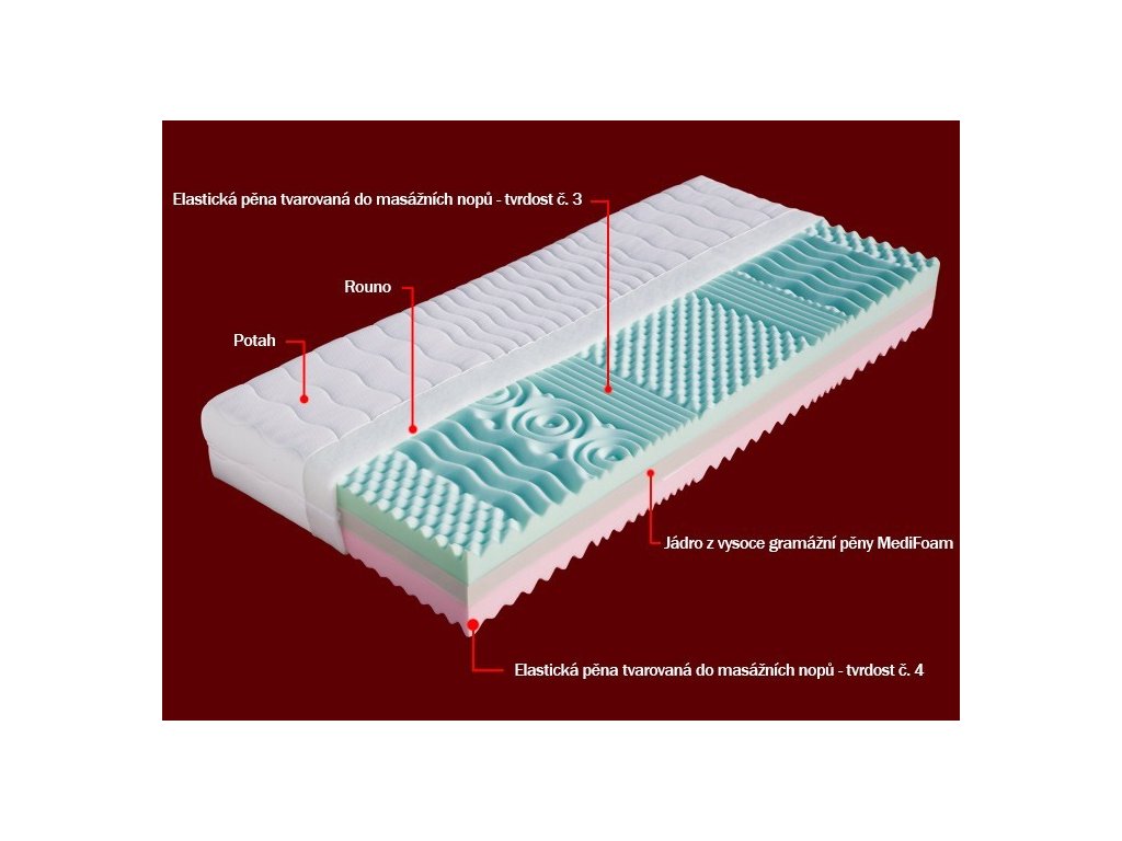 Sedmizónová matrace s volbou dvojí tuhosti. Střed jádra matrace je zpevněn vysoce gramážní pěnou MediFoam. Nosné vrstvy jsou tvořeny kvalitními elastickými pěnami, které jsou tvarovány do masážních nopů. Nopy zabezpečují prokrvení pokožky a uvolnění svalů během spánku. Matrace je vhodná na všechny typy roštů.
