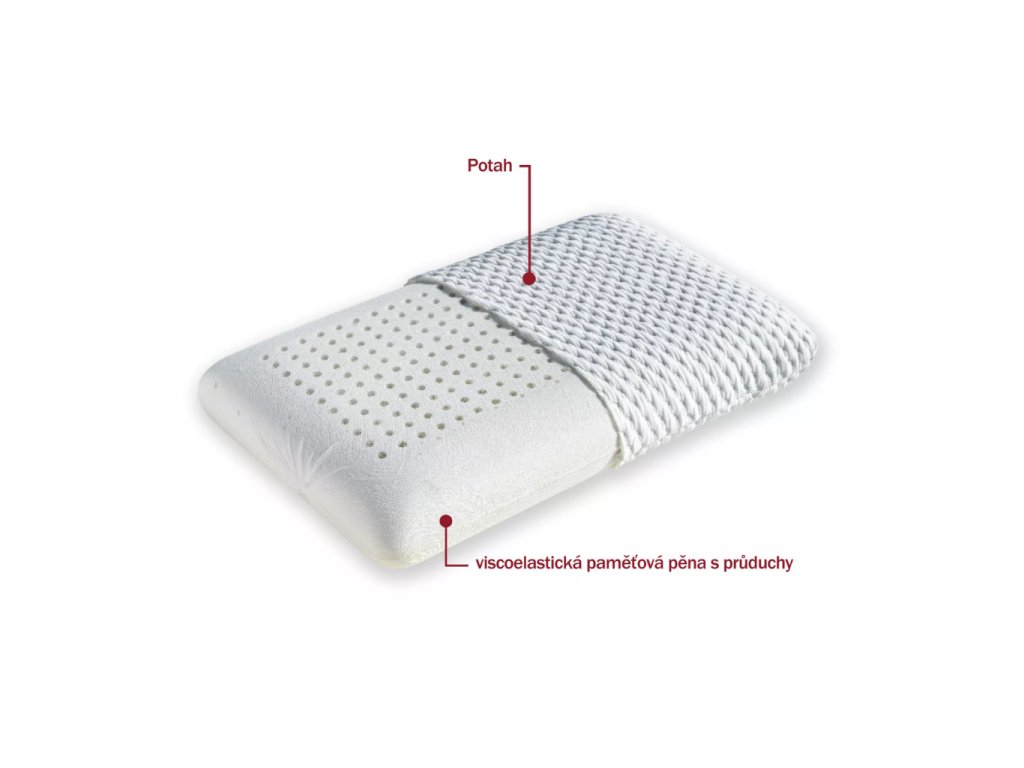 Jádro polštáře tvoří viscoelastická paměťová pěna s průduchy, díky kterým je polštář vzdušný a zároveň poskytuje dostatečnou oporu a odlehčuje zatížení krčních a šíjových svalů.