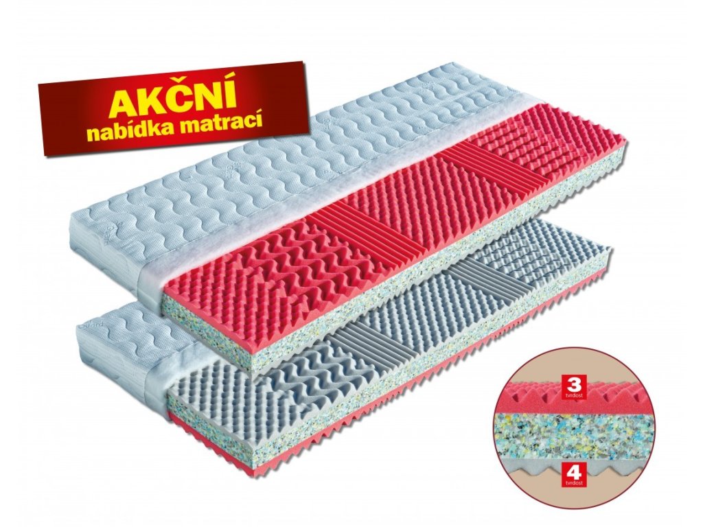 Sendvičová matrace s jádrem z pojeného polyuretanu ve výšce 7 cm. Vrchní stranu matrace tvoří elastická antibakteriální pěna s úpravou Sanitized, která poskytuje trvalou a účinnou ochranu proti bakteriím, roztočům a plísním. Je tvarovaná do nopů, má tvrdost č. 3. Druhou stranu tvoří tvrdší pěna MediFoam tvarovaná do masážních nopů, tvrdost č. 4. Matrace je určená pro širokou škálu uživatelů a je vhodná na všechny typy roštů. Celková výška matrace cca 15 cm.