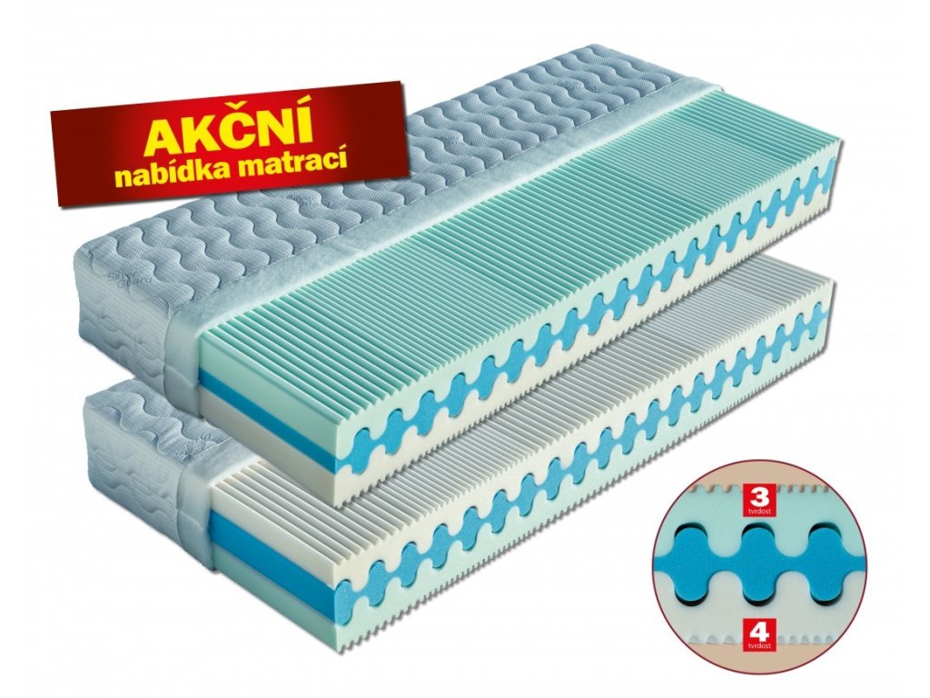 Komfortní, 25 cm vysoká matrace s volbou dvojí tvrdosti. Vrchní vrstvy jsou tvořeny vysoce gramážní pěnou MediFoam (38 a 30 kg/m³) s tvrdostí 3 a 4. Tyto odolné a pružné pěny jsou spojené středem s pevným vlnkovitým jádrem (35 kg/m³) bez použití lepidla. Průduchy mezi jednotlivými vrstvami slouží k dobré ventilaci a odvodu přebytečné vlhkosti. Jemná masážní profilace na povrchu pěn uvolní napjaté svalstvo a přinese Vám kvalitní spánek. Matrace je vhodná pro všechny typy roštů.