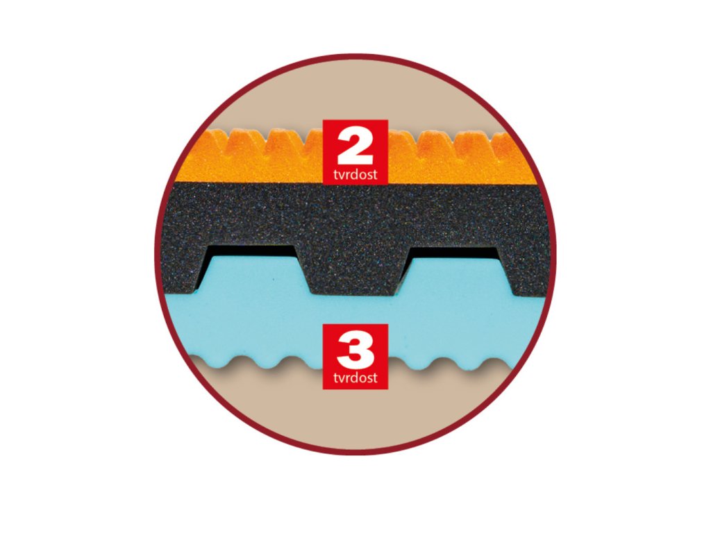 Kvalitní matrace, jejíž oranžovou nosnou vrstvu tvoří oblíbená líná bio pěna tvarovaná do masážních nopů. Bio pěna obsahuje sójový extrakt, který má příznivý vliv na lidský organizmus. Střed jádra je složen ze dvou elastických pěn MediFoam odlišných objemových hmotností a je provzdušněn příčnými průduchy, které zaručují změkčení matrace v exponovaných místech.