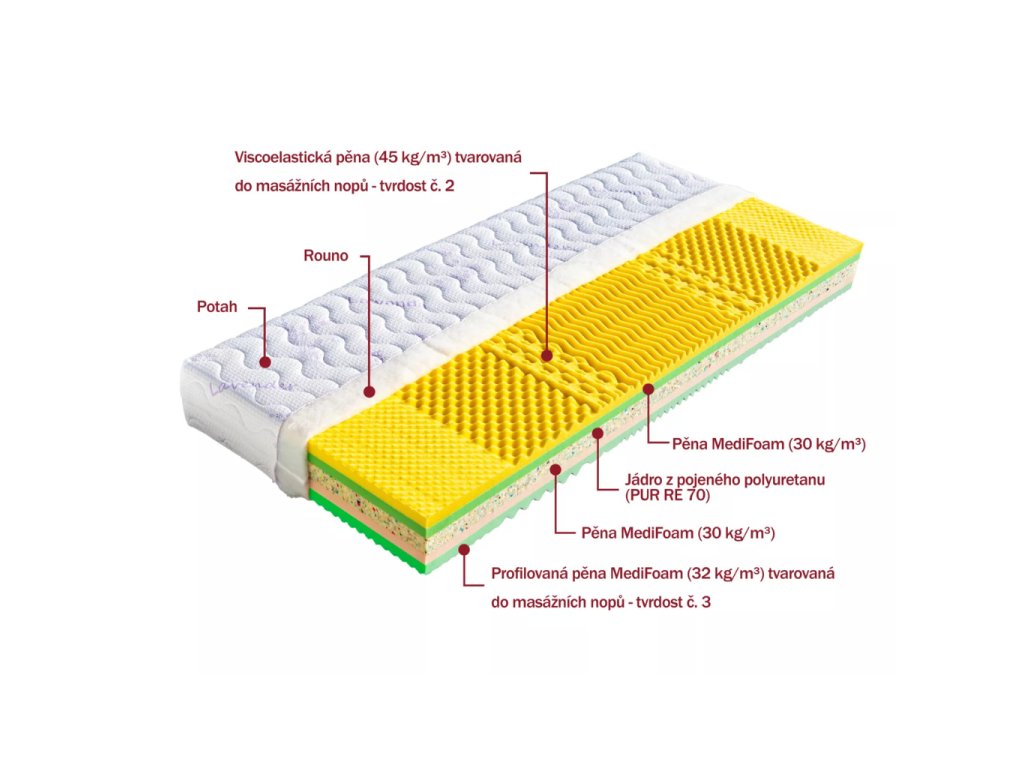 Díky inovativní kombinaci paměťové pěny a pěny MediFoam nabízí optimální rovnováhu mezi pohodlím a pevnou oporou. Pomáhá předcházet bolestem zad, uvolňuje svaly a podporuje správnou ergonomii těla během spánku. Měkčí strana (tvrdost č. 2) je tvořena viscoelastickou pěnou tvarovanou do masážních nopů (45 kg/m³). Pěna reaguje na tělesné teplo a přizpůsobuje se konturám těla. Pod ní je vrstva pěny MediFoam (30 kg/m³). Vyztužení a odolnost matrace je zabezpečena vysoce gramážní plotnou pojeného polyuretanu (RE 70) ve střední části matrace. Tvrdší stranu (tvrdost č. 3) tvoří rovná plotna pěny MediFoam (30 kg/m³) společně s další vrstvou (32 kg/m³) tvarovanou do masážních nopů v sedmi zónách.